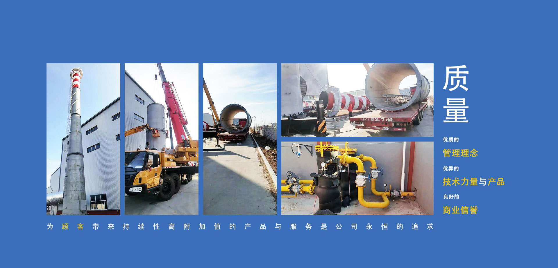 公司制定了“以质量求生存、以管理求发展、以服务增信誉”的质量方针。通过了质量管理体系、环境管理体系、职业健康安全管理体系、企业信用评价管理体系(AAA级)、五星级售后服务;取得了D1、D2级压力容器制造生产许可资质,压力管道元件制造生产许可资质;黑龙江省高新技术企业。